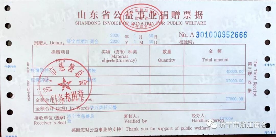 2020年1月30日15时,募捐到账的第一批善款77000元,已第一时间汇入济宁市慈善总会,用于“新型冠状病毒”疫情防控工作。