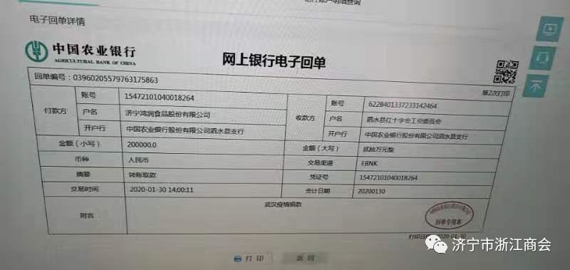 1月30日,山东省浙江商会副会长单位、济宁市浙江商会执行会长单位—济宁鸿润食品股份有限公司通过泗水县红十字会工会委员会向武汉捐赠20万人民币,用于抗击新型冠状病毒肺炎疫情。