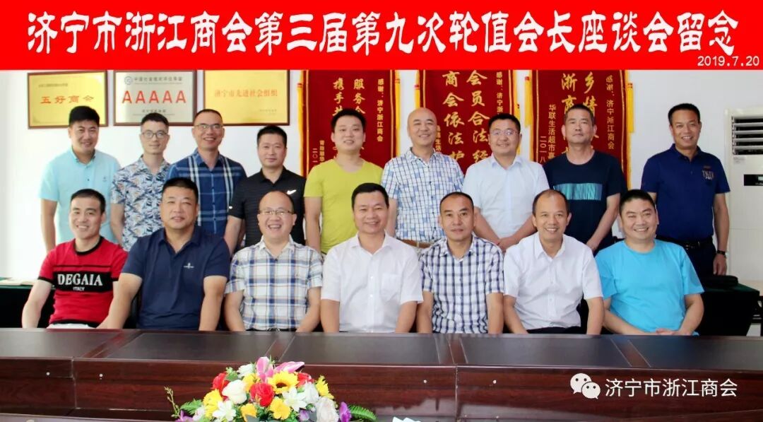 7月20日上午,济宁市浙江商会第三届第九次轮值会长座谈会在商会会议室召开。会议由七月份轮值会长、济宁瑞腾置业有限公司董事长潘贻炯、(曾国荣协助)主持召开,商会会长郑朝国,执行会长张纯枢,常务副会长金献东、王德定、郑泽和,副会长朱圣义、潘志勇、谢泽成,理事郑建荣、张金升、袁春苗、盛小林,商会法律顾问鹿海涛等参加会议。