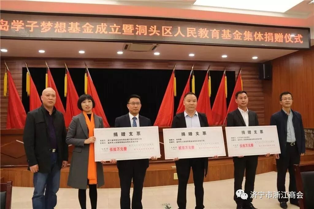 其中,济宁市浙江商会副会长李明德先生独立捐赠资金设立总额为200万元人民币的“明德百岛学子梦想基金”,北京洞头商会、洞头农商银行分别捐资50万。