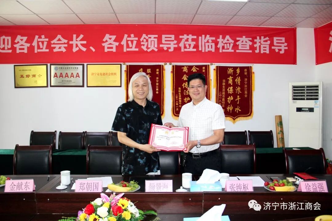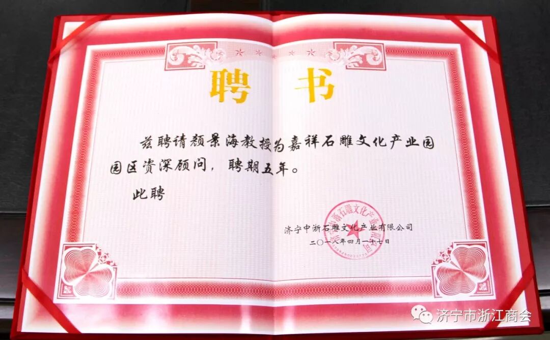 商会常务副会长兼秘书长、中国(嘉祥)石雕文化产业园区总经理徐益强代表公司特聘请山东省浙江商会首席顾问颜景海为企业资深顾问,并亲手呈上证书。